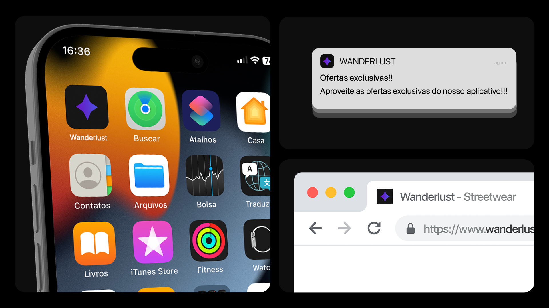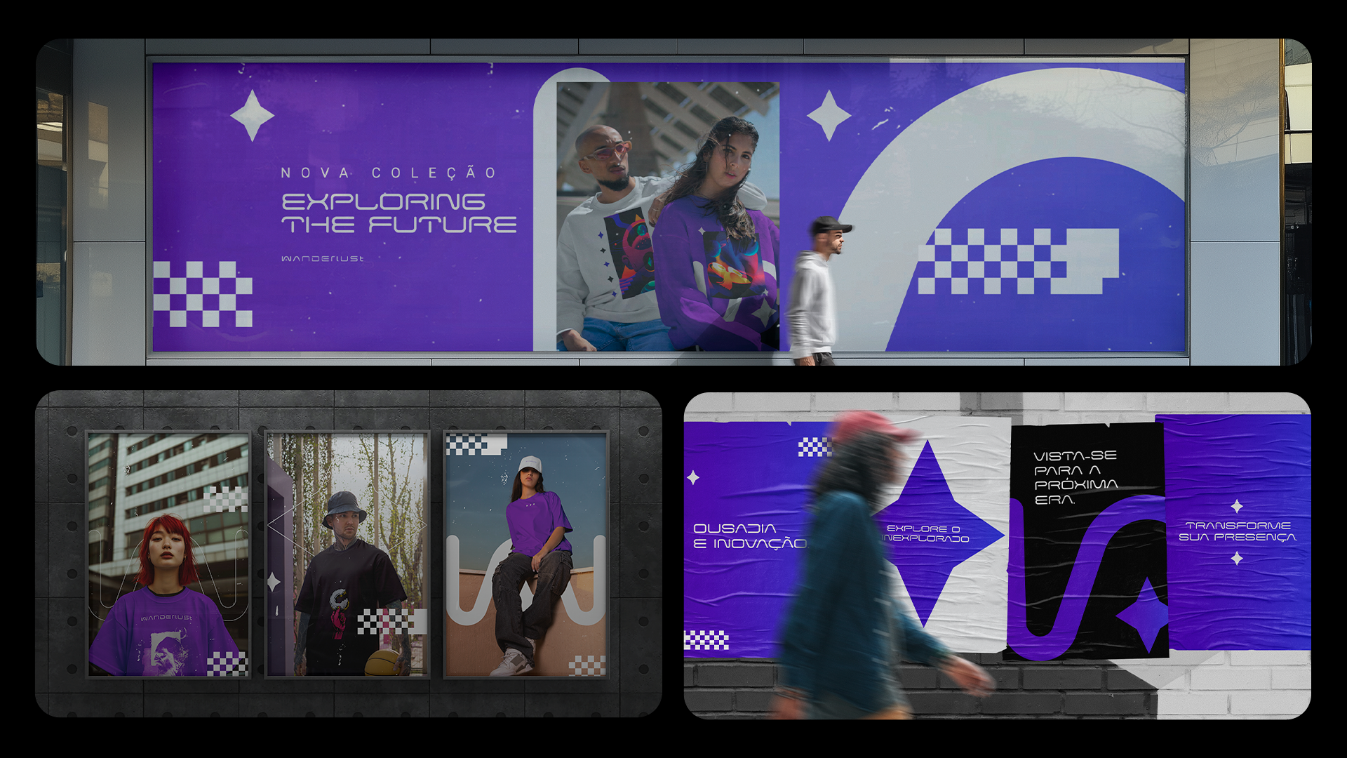 Wanderlust foi pensada para se destacar em diversos meios, refletindo a essência do nosso estilo urbano e futurista. Cada elemento da marca, desde a tipografia até a paleta de cores, é projetado para criar uma presença marcante e coesa.