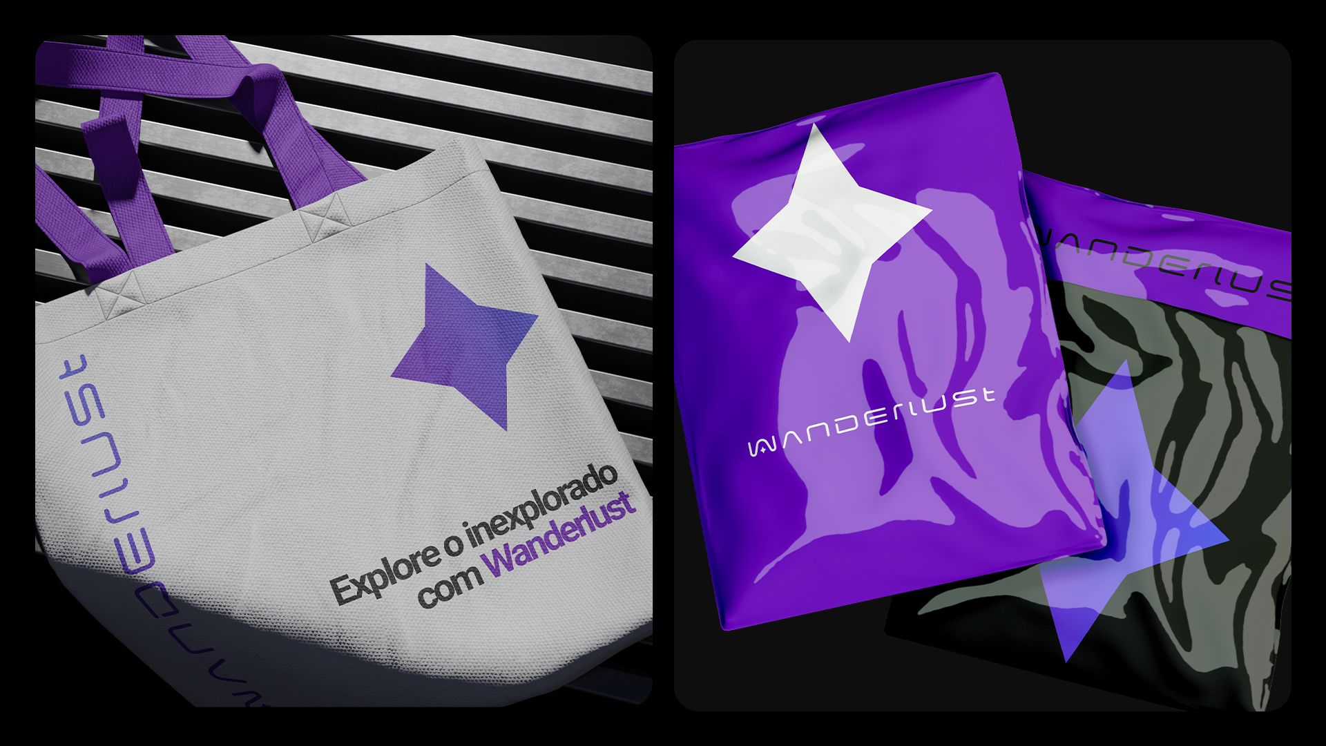 Wanderlust foi pensada para se destacar em diversos meios, refletindo a essência do nosso estilo urbano e futurista. Cada elemento da marca, desde a tipografia até a paleta de cores, é projetado para criar uma presença marcante e coesa.